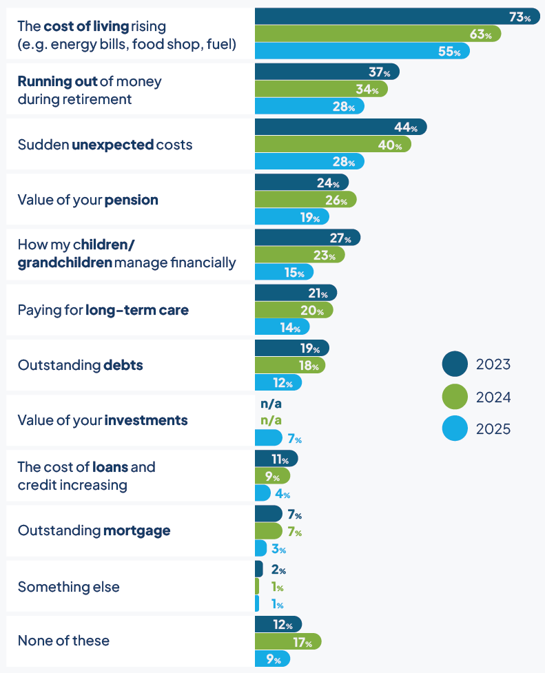But – like the rising cost of living – the percentage of people saying they’re worried about these things has dropped. Running out of money during retirement has dropped by 6% since 2024 (and by 12% since 2022), and sudden unexpected costs by 12% since 2024.