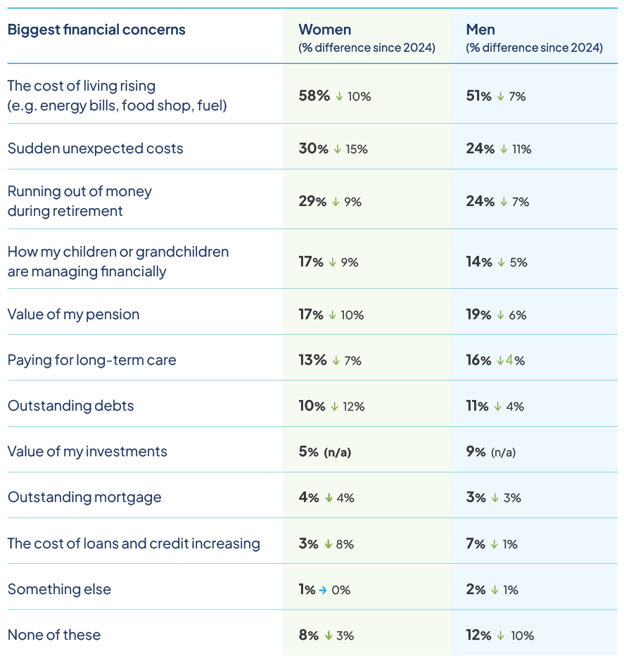 More women than men name the rising cost of living, sudden unexpected costs, running out of money during retirement, and how children and grandchildren are coping financially as their biggest money worry.