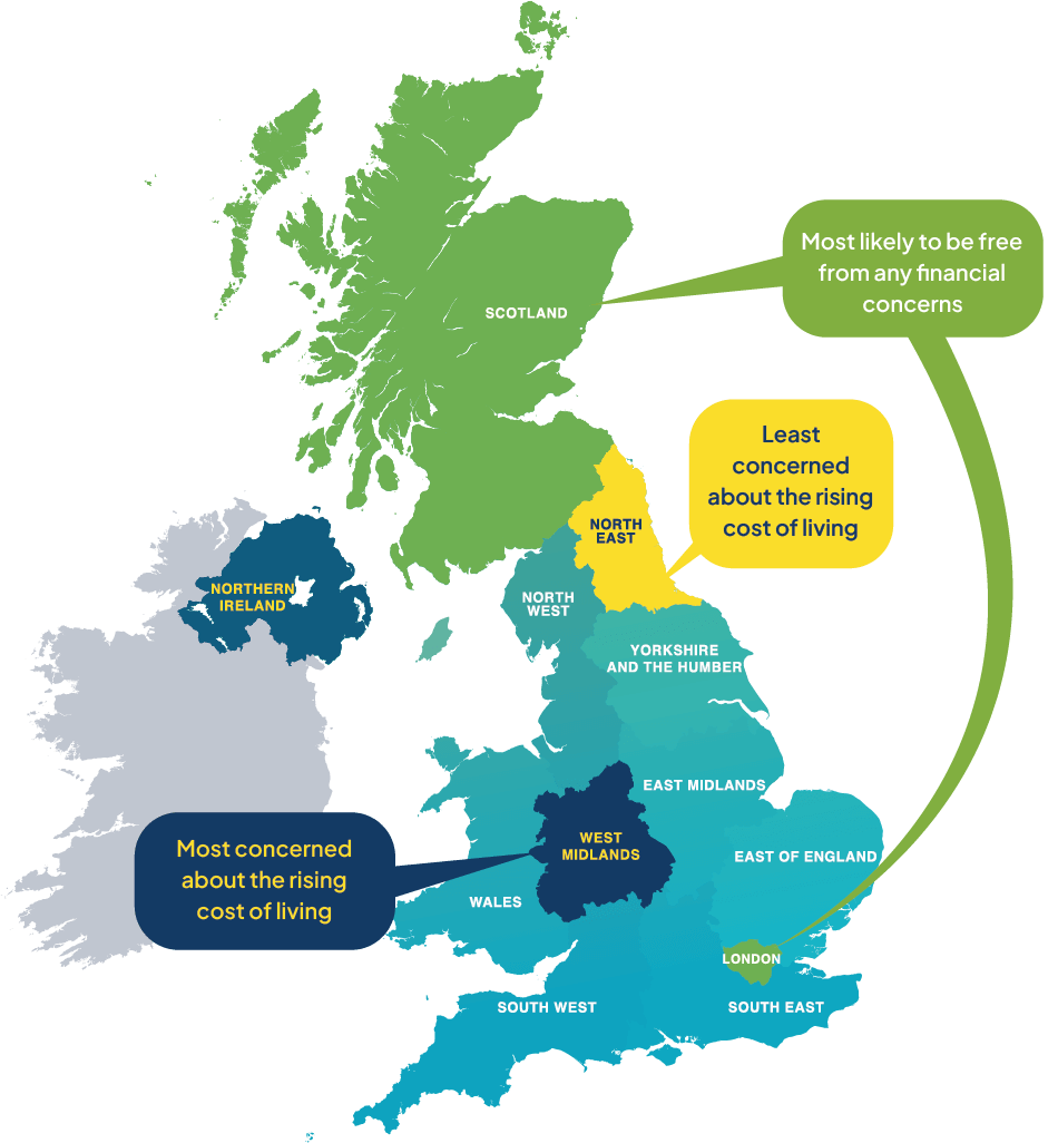 At 56%, both England and Scotland are the most worried about the rising cost of living, compared to 41% in Wales. Wales is also the least worried about sudden unexpected costs, at 13%, compared to Northern Ireland at 32%.