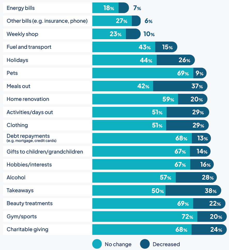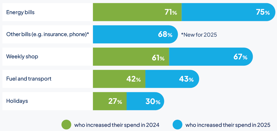 The research for this study was conducted in Spring and Summer 2025, while the high cost of living was still affecting many in the UK. So it's no surprise that 75% of people say they're spending more on energy bills, and 68% on other bills such as phones and insurance.