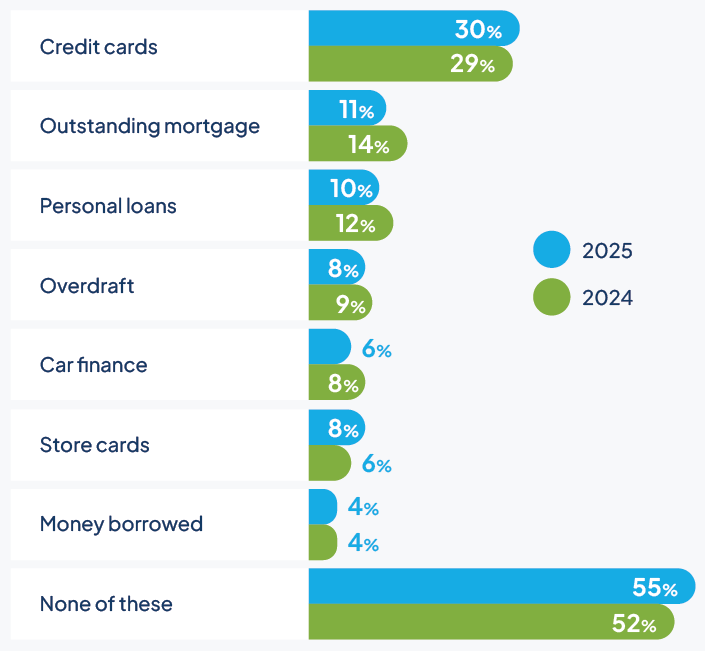 45% of people have outstanding debts – 3% down since 2024, and 1% up since our first report in 2022. Like previous years, the debts are mostly credit cards, mortgages and personal loans.