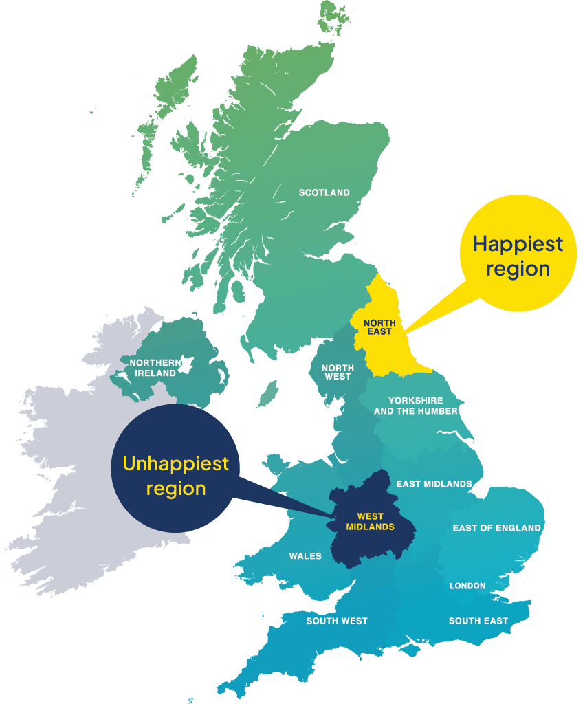 In 2025, Wales has been overtaken as the happiest region by North East England, with 48% rating their overall happiness at 8 to 10 out of 10. This is closely followed by East Anglia at 44% – quite the turnaround, as this region was one of the least happy in 2024! The least happy region is the West Midlands, where only 35% feel the same.