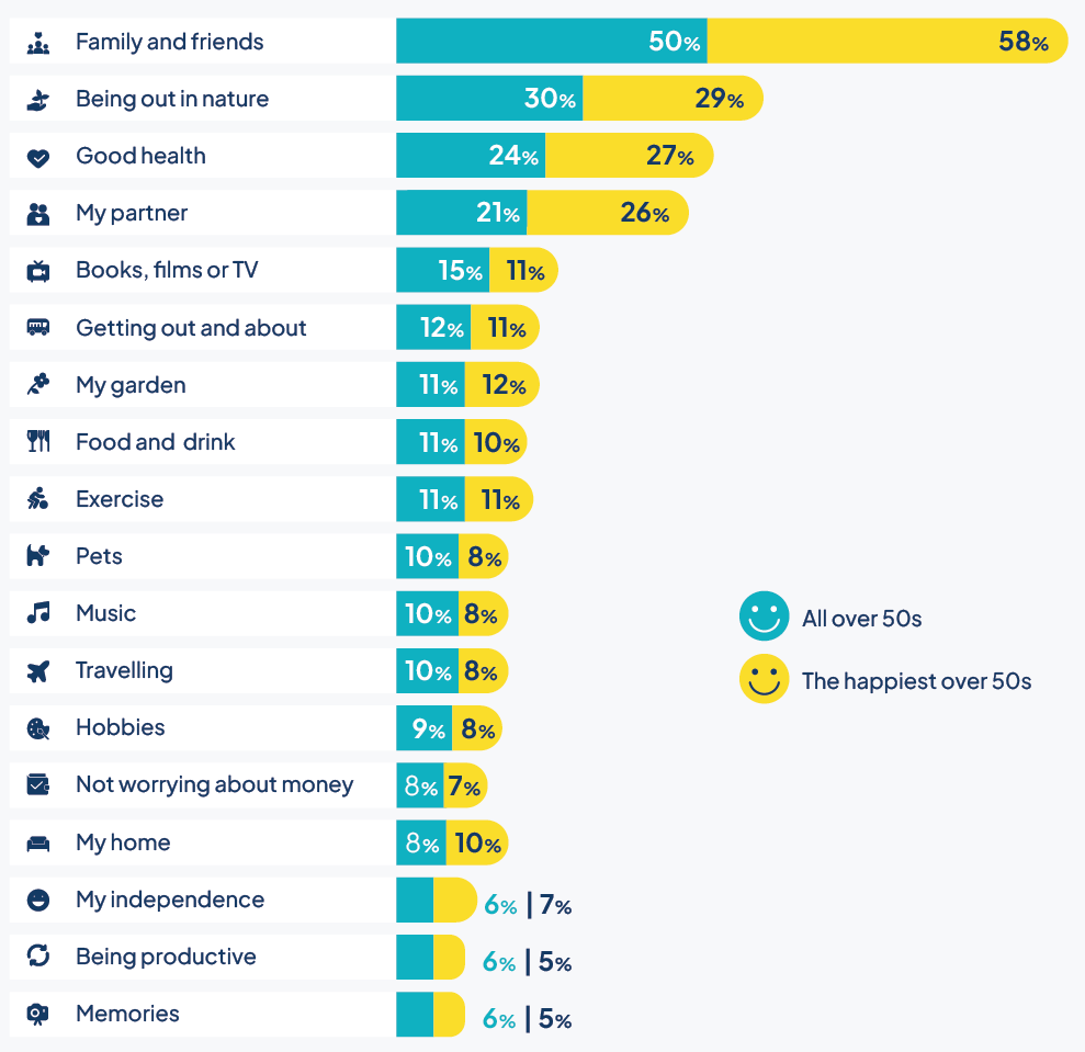 The percentages shift if we look at what matters most to the happiest people. Family and friends keep the top spot, but with an 8% rise (58%). Being out in nature remains in second place at 29%, while good health is in third place 27%. Our partner sits at fourth place with 26%.
