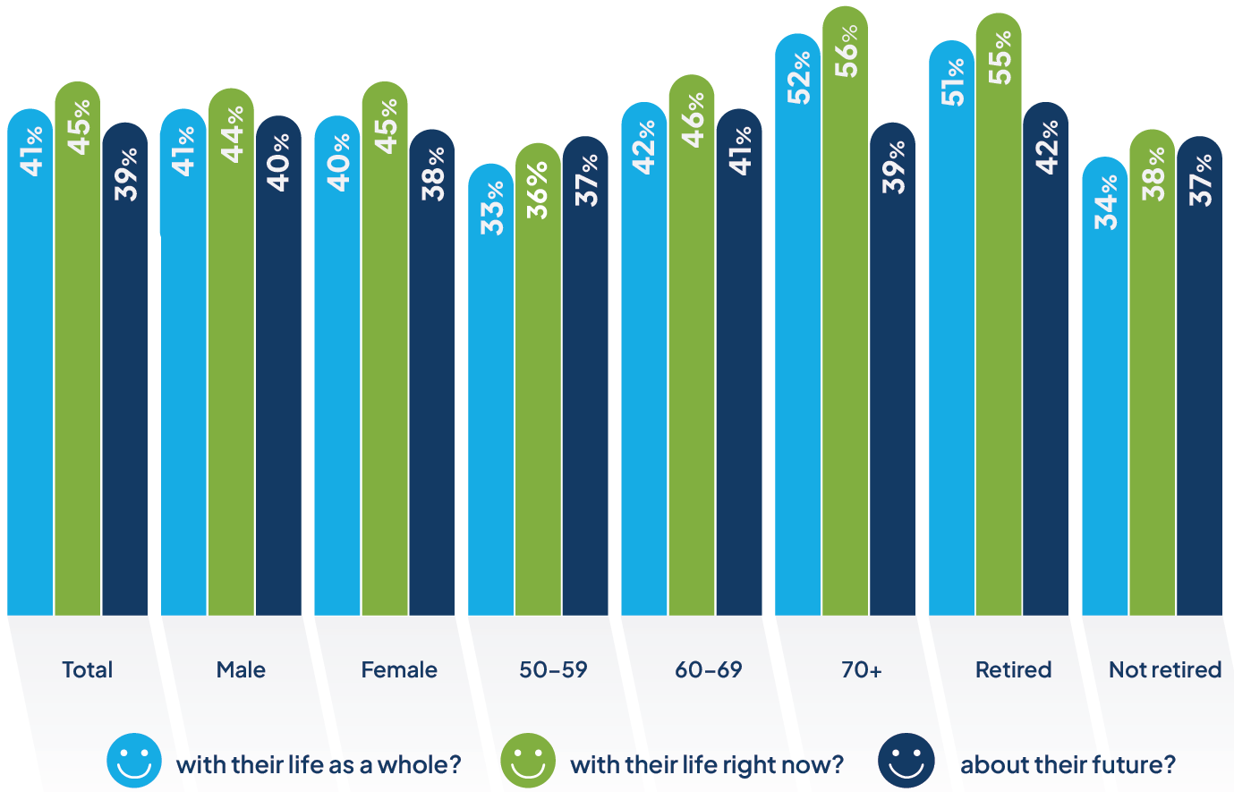 Happiness rises both with age and upon retirement. 51% (-1%) of retirees score 8 or higher for overall life satisfaction, compared to just 34% of those who are still working. And 52% of people over 70 also gave these higher happiness scores.