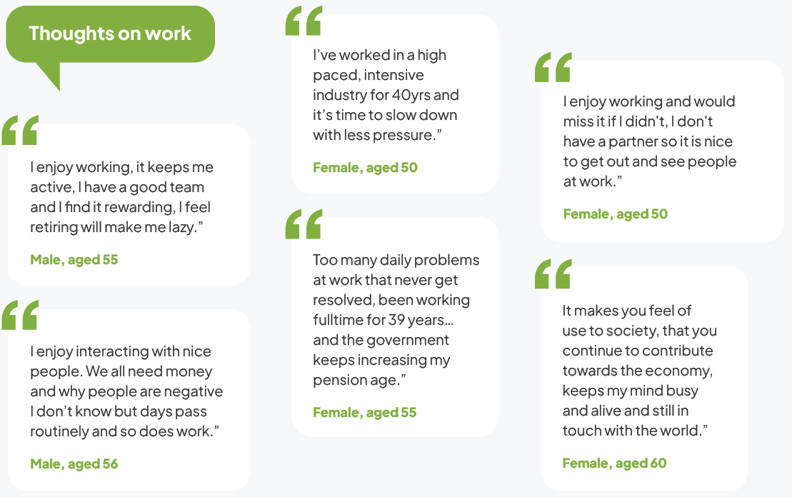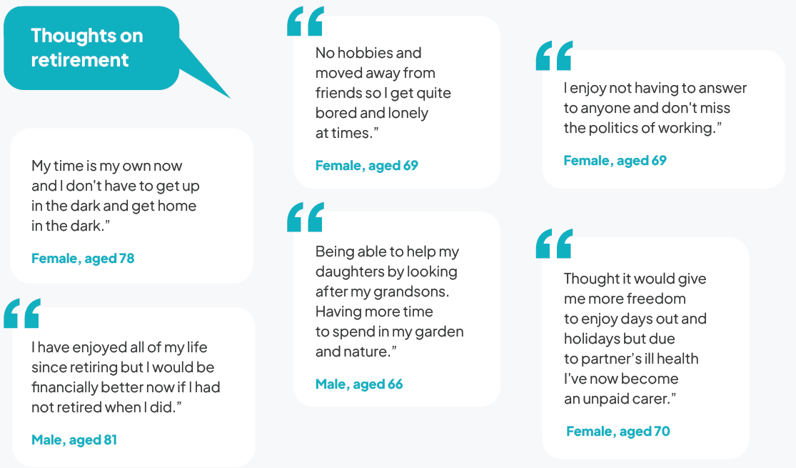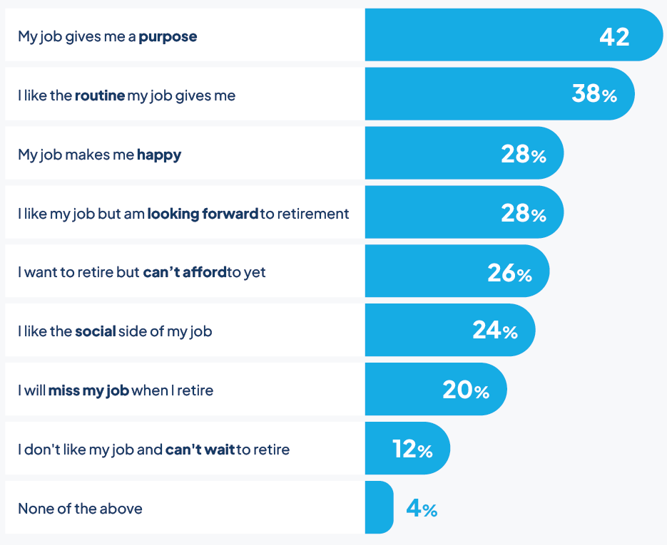But this doesn’t mean that those who haven’t retired are unhappy with their jobs. On the contrary, over two thirds of working people are positive about their job, with 2 in 5 saying their work gives them purpose. Meanwhile, some who are retired report feeling lonely or bored, and not having as much money coming in.