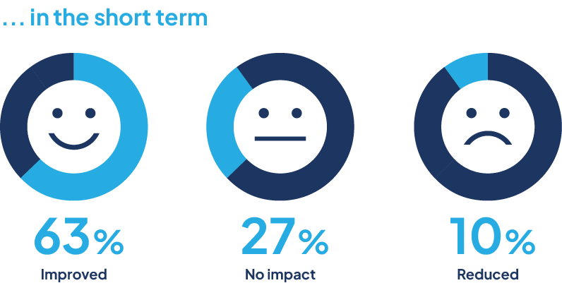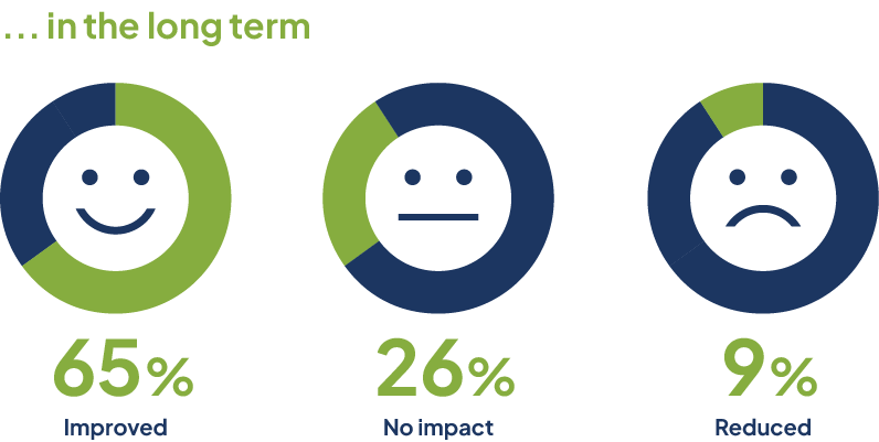 As we’ve seen in our section on happiness, retiring improves people’s happiness. 65% of those who’ve retired say they are happier in the long term (1% down since 2024, and 2% down since our first report in 2022), and 63% in the short term (down 3% since 2024, and 1% since our first report).