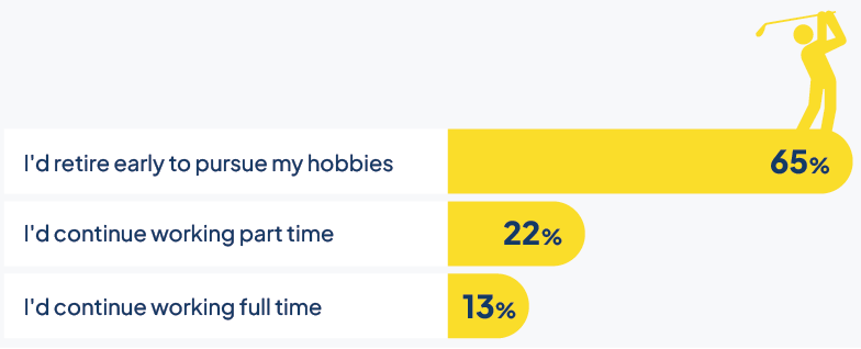 If money wasn’t an issue, 65% of people who are yet to retire would like to retire early to pursue their hobbies – 10% up since 2024. 35% would continue working either full or part time, compared to 45% last year.