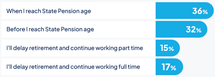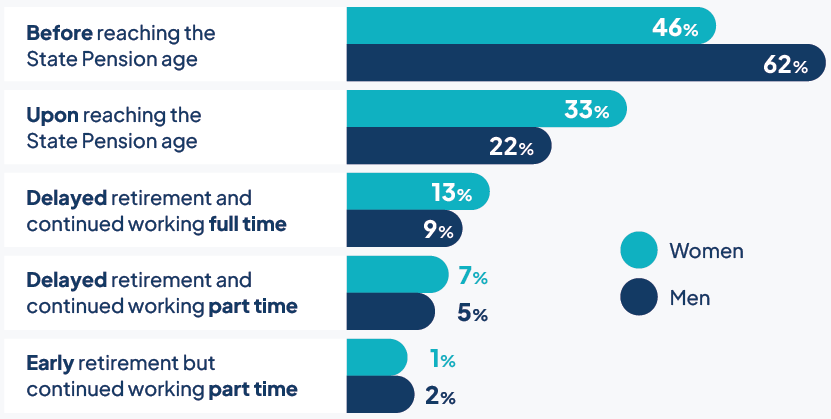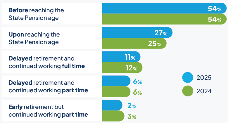 Over half (54%) of respondents who are retired did so before reaching the State Pension age – 2% more than in our first report in 2022. And like in 2022, around 1 in 10 delayed their retirement to continue working full time.